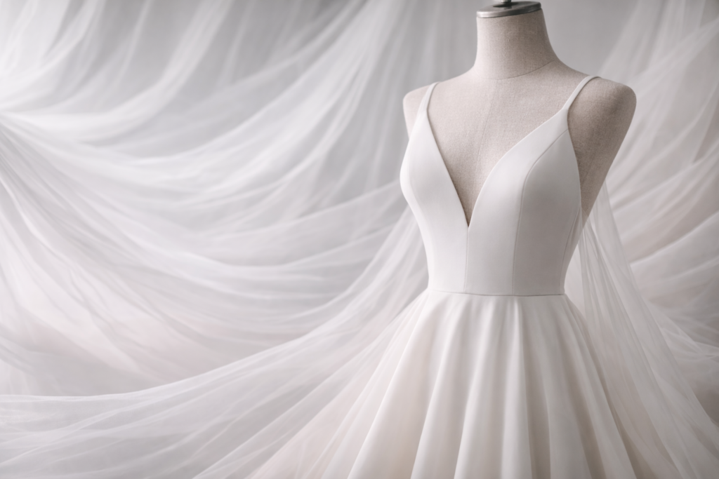 At Ziva, every gown begins with thoughtfully chosen fabrics selected for their drape, comfort, and finish. From soft tulles and structured satins to delicate lace, each material is chosen to create timeless silhouettes that feel as beautiful as they look. Our fabrics are selected to balance elegance, durability, and affordability, ensuring every bride receives a gown that photographs beautifully and wears comfortably.